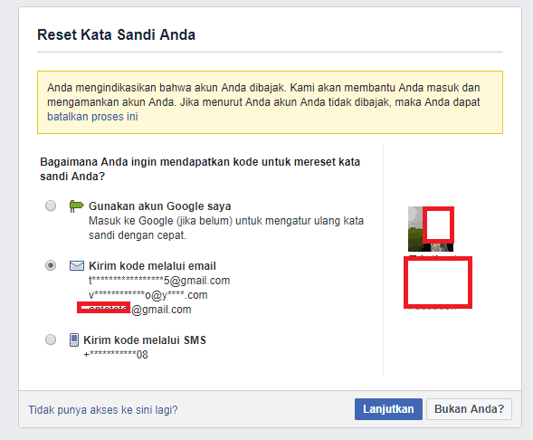• Pilih ‘Kirimi saya SMS’ yang di dalamnya berisi kode untuk mengatur ulang kata sandi, lalu klik ‘Lanjutkan’.