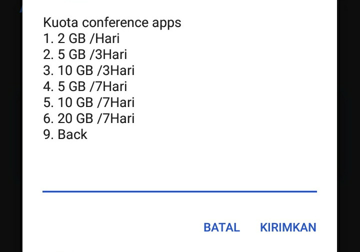 Paket dengan kuota internet khusus untuk meeting digunakan untuk akses ke aplikasi microsoft teams, Web ex, umeetme dan CloudX yang merupakan saingan dari zoom. Ingat ya bahwa kuota internet ini hanya bisa digunakan untuk akses ke beberapa aplikasi meeting dan tidak bisa digunakan untuk aplikasi lainnya apalagi game.